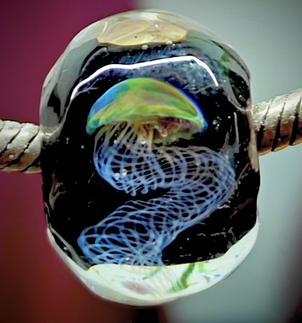 This is a detailed tutorial that teaches you one technique of making a 104 C.O.E jellyfish bead. you will learn how to use and apply stringers, one method of tentacle preparation, how to make an organic shaped jellyfish inside a solid clear glass bead.